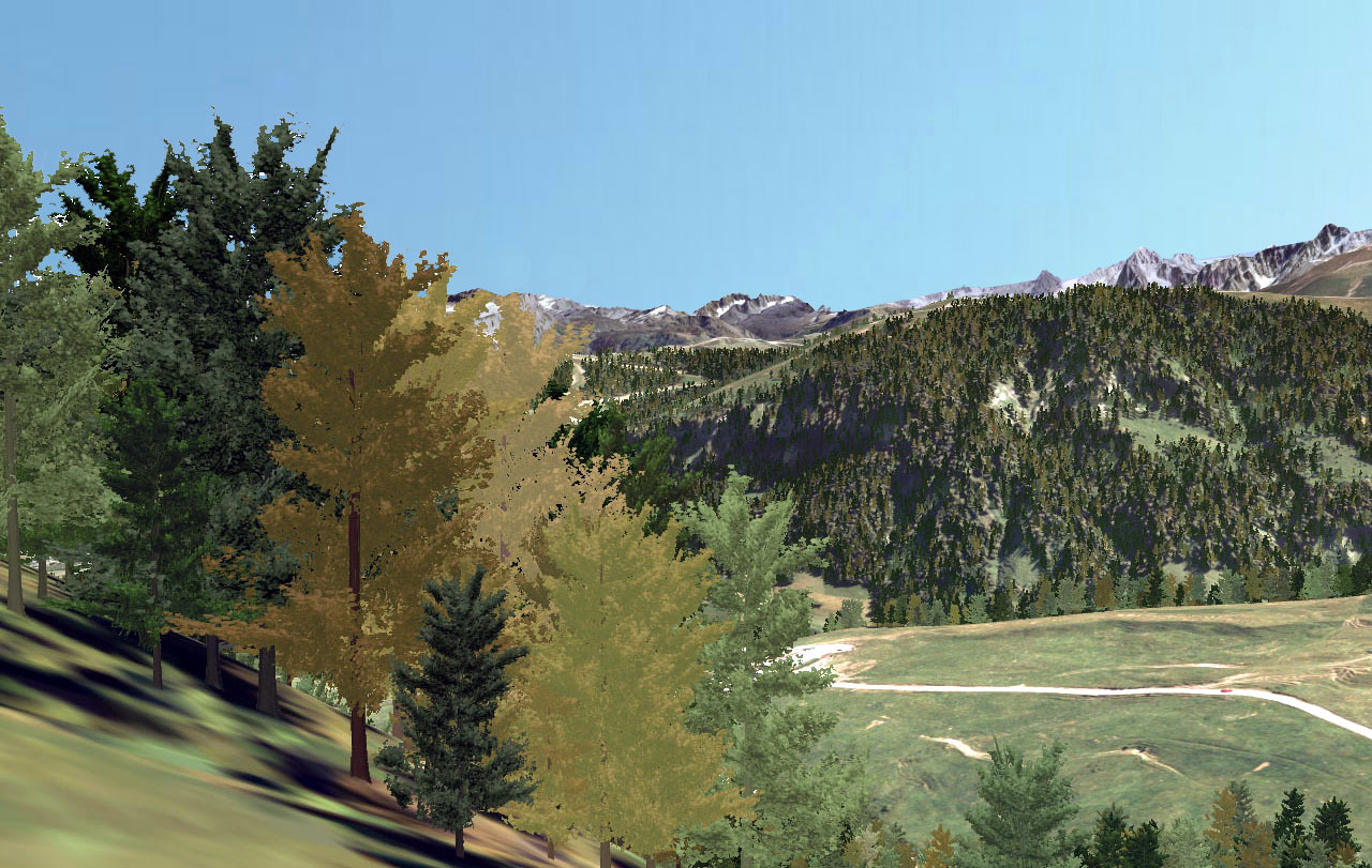 Enfin, pour la synthèse d’objets similaires du sursol rendus un très grand nombre de fois, Xavier Marsault, Sylvain Meunier et Yacine Amara ont développé un modèle à bases de graines, qui génère « à la volée » la position et les propriétés des instances. On s’est pour l’instant limité aux cas des arbres. Un premier algorithme tire au mieux partie des capacités offertes par les récents GPU pour réaliser une sélection très performante des graines respectant une cohérence spatiale avec l’analyse des matières présentes au sol, grâce à un codage performant des indexes de matières dans les derniers niveaux du texture-quadtree. Un second algorithme s’occupe du rendu des instances correspondantes. On a implémenté deux approches générant peu de polygônes : les point-trees et les billboard-clouds.