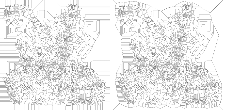 La méthode fournit de bons résultats mais pas nécessairement une optimisation globale (la consolidation du choix des critères est loin d’être achevée). Qualitativement, on observe nettement sur les larges tissus un découpage en îlots plausibles traduisant l’émergence d’un niveau morphologique supérieur à celui des seuls axes.