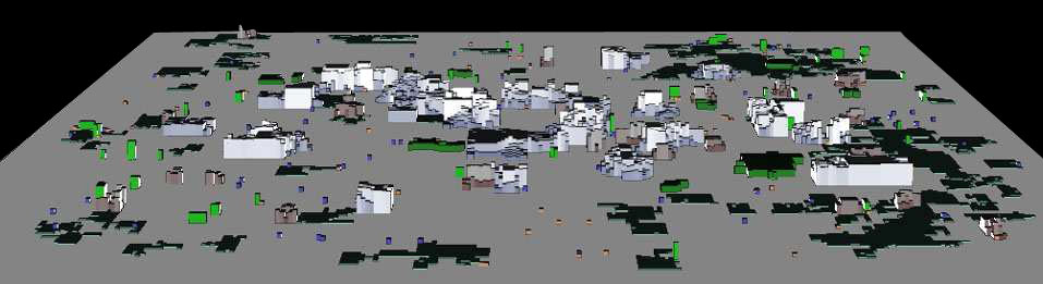 Dans cette mouvance, nous avons lancé une étude visant à capter la cohérence interne de modèles géométriques de villes par le biais de la détection de leurs similitudes internes, en utilisant un modèle mathématique approximatif issu du domaine de la compression fractale des images. On s’est ensuite intéressé à la synthèse de textures urbaines, et aux formes architecturales (isolées ou groupées) présentant des similarités, voire des autosimilarités.